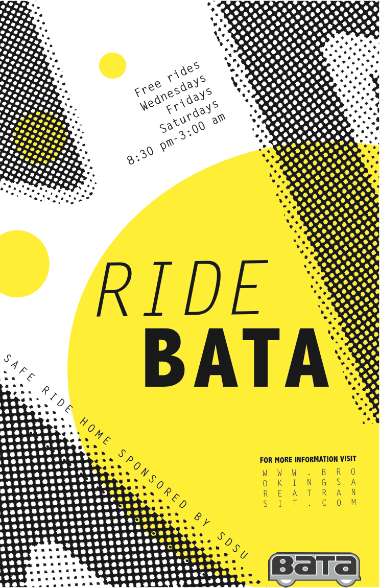Objective: Begin to learn how organizations communicate to user groups and audiences and how this can be applied in relation to visual communication and graphic design. I produced a poster for the Brookings Area Transit Authority to promote free rides offered through Safe Ride Home.